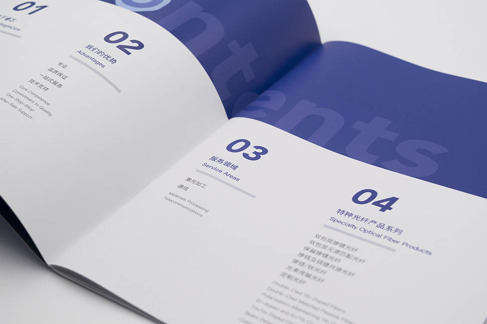 項(xiàng)目背景:武漢睿芯特種光纖有限責(zé)任公司成立于2013年,是國有控股的高科技企業(yè)。主要從事光纖、特種光纖、光學(xué)元器件的研究、開發(fā)、生產(chǎn)、銷售、維修服務(wù)、技術(shù)咨詢等。從事以上產(chǎn)品的貨物進(jìn)出口、技術(shù)進(jìn)出口和代理進(jìn)出口工作。艾的爾設(shè)計(jì)承接其企業(yè)宣傳冊設(shè)計(jì)及制作,成立品牌設(shè)計(jì)小組,與企業(yè)進(jìn)行深入溝通,明確企業(yè)對于畫冊設(shè)計(jì)的需求,白色與紫色相結(jié)合,與手冊主題相結(jié)合,手冊是特種光纖,產(chǎn)品手冊&服務(wù)。