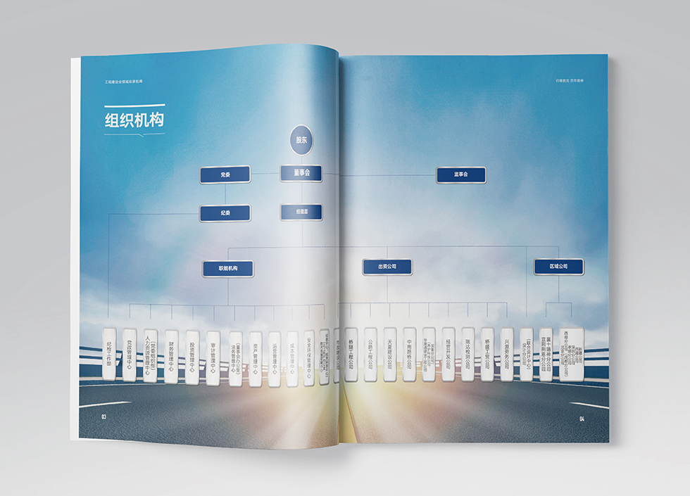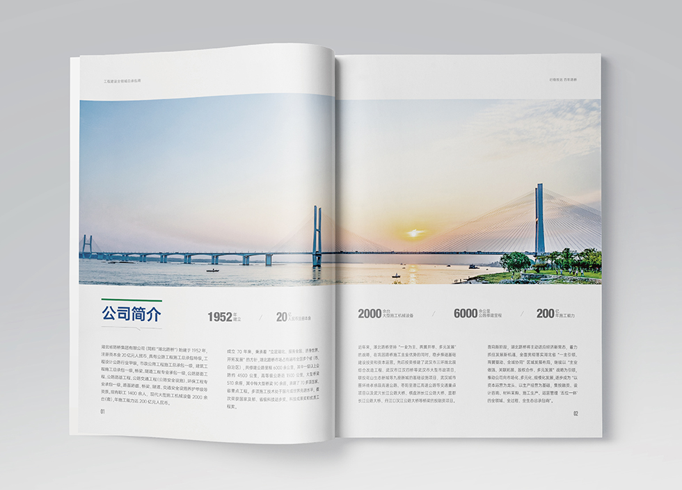 項目背景:湖北路橋是一家建筑施工總承包一級控股公有公路工程施工總承包特級、市政公用工程施工總承包一級、橋梁、隧道工程專業(yè)承包一級資質的公司,愿景是成為最具國際競爭力的綜合型建筑企業(yè)集團,艾的爾設計接受其委托,承接畫冊設計項目。在畫冊設計、創(chuàng)意的過程中,設計師通過對行業(yè)屬性進行深入地了解,根據(jù)企業(yè)屬性,進行了畫冊設計、創(chuàng)意?;诖?,封面采用公司具有意義的代表性工程的插畫形式,展現(xiàn)結構與專業(yè)性、行業(yè)屬性。整體采用品牌標準色藍色,穩(wěn)重不失活力,內頁使用建筑工程概念圖占據(jù)大幅畫面,給讀者視覺上的享受與直觀的業(yè)績展現(xiàn)