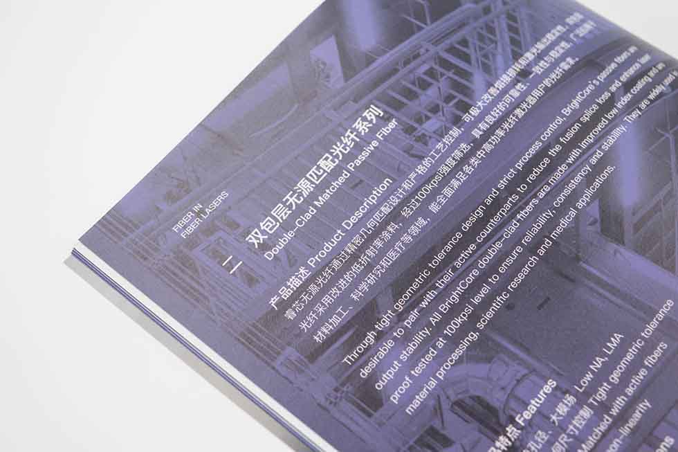 項(xiàng)目背景:武漢睿芯特種光纖有限責(zé)任公司成立于2013年,是國有控股的高科技企業(yè)。主要從事光纖、特種光纖、光學(xué)元器件的研究、開發(fā)、生產(chǎn)、銷售、維修服務(wù)、技術(shù)咨詢等。從事以上產(chǎn)品的貨物進(jìn)出口、技術(shù)進(jìn)出口和代理進(jìn)出口工作。艾的爾設(shè)計(jì)承接其企業(yè)宣傳冊設(shè)計(jì)及制作,成立品牌設(shè)計(jì)小組,與企業(yè)進(jìn)行深入溝通,明確企業(yè)對于畫冊設(shè)計(jì)的需求,白色與紫色相結(jié)合,與手冊主題相結(jié)合,手冊是特種光纖,產(chǎn)品手冊&服務(wù)。