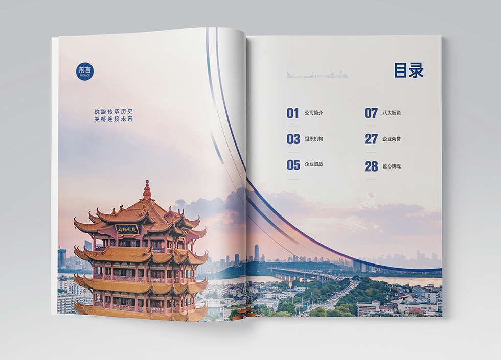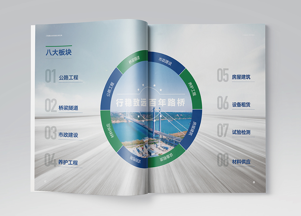 項目背景:湖北路橋是一家建筑施工總承包一級控股公有公路工程施工總承包特級、市政公用工程施工總承包一級、橋梁、隧道工程專業(yè)承包一級資質的公司,愿景是成為最具國際競爭力的綜合型建筑企業(yè)集團,艾的爾設計接受其委托,承接畫冊設計項目。在畫冊設計、創(chuàng)意的過程中,設計師通過對行業(yè)屬性進行深入地了解,根據(jù)企業(yè)屬性,進行了畫冊設計、創(chuàng)意?;诖?,封面采用公司具有意義的代表性工程的插畫形式,展現(xiàn)結構與專業(yè)性、行業(yè)屬性。整體采用品牌標準色藍色,穩(wěn)重不失活力,內頁使用建筑工程概念圖占據(jù)大幅畫面,給讀者視覺上的享受與直觀的業(yè)績展現(xiàn)