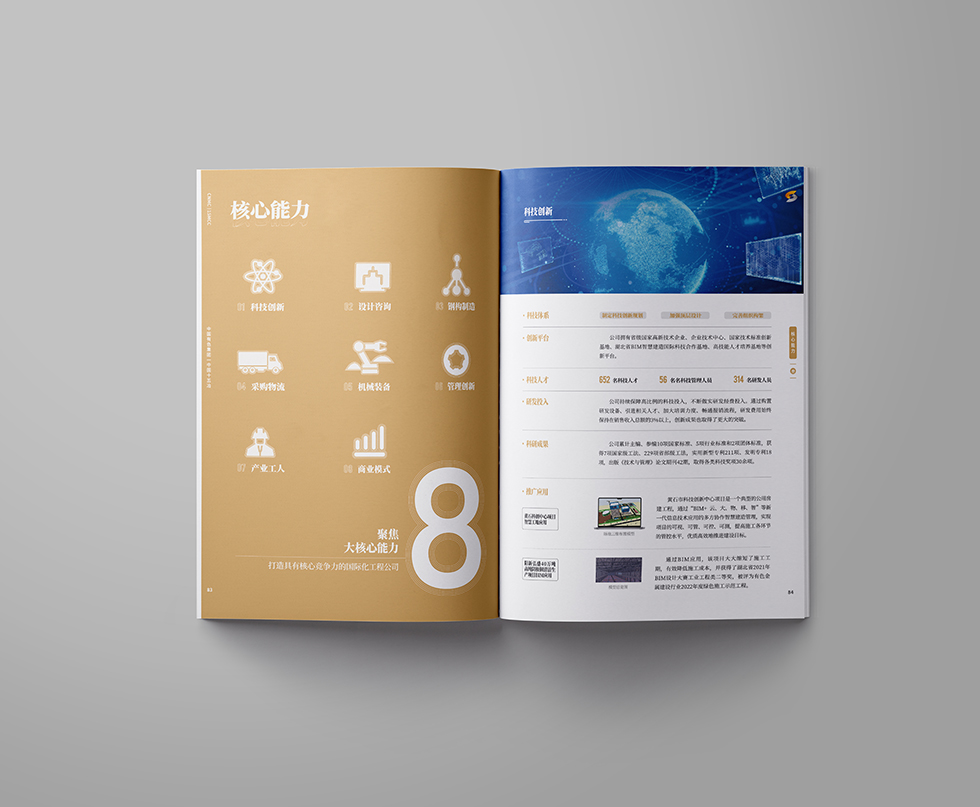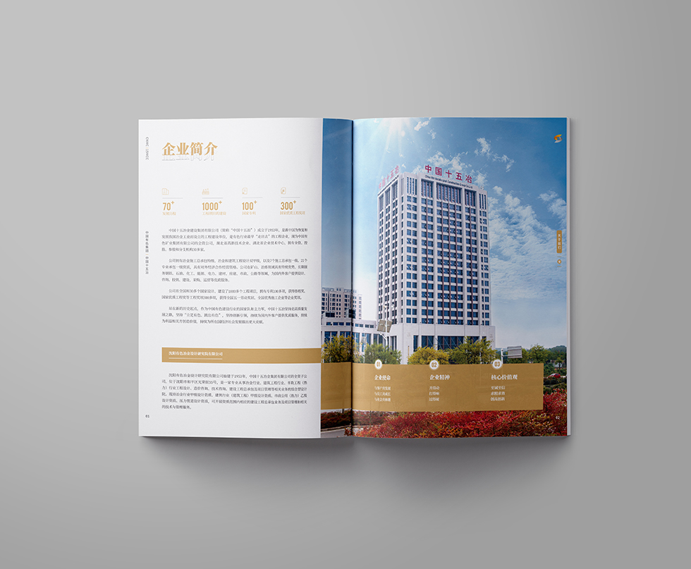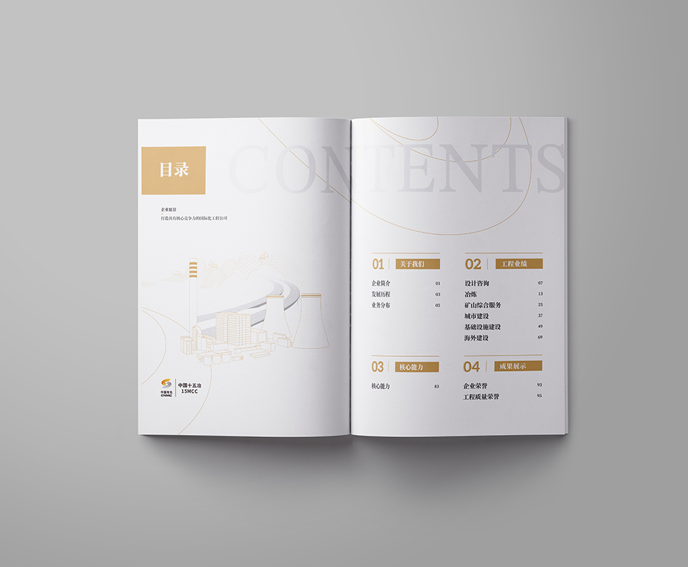 項目背景:中國十五冶金建設(shè)有限公司(簡稱“中國十五冶”)是具有特級總承包資質(zhì)的大型國有施工企業(yè),隸屬于國務(wù)院國資委直管的中國有色礦業(yè)集團有限公司。中國十五冶成立于1953年,現(xiàn)有資產(chǎn)40余億元,從業(yè)人員2萬余人,其中核心管理人員約5000人;擁有施工機械設(shè)備4998臺(套),動力裝備率為31.75kw/人,技術(shù)裝備率為130372元/人。公司擁有冶煉工程總承包特級資質(zhì),礦山工程、電力工程、公路工程、房屋建筑工程、機電安裝工程、石油化工工程、市政工程等7項總承包一級資質(zhì)及5項專業(yè)資質(zhì)。同時,還具有對外經(jīng)濟合作經(jīng)營資格、進出口企業(yè)資格和對外援助成套項目施工任務(wù)A級實施企業(yè)資格,可從事境外承包工程、輸出勞務(wù)和相關(guān)進出口業(yè)務(wù)。艾的爾設(shè)計承接其畫冊設(shè)計,成立品牌設(shè)計小組,與企業(yè)進行深入溝通,明確企業(yè)對于畫冊設(shè)計的需求,封面大面留白,整體顯得干凈、大氣、識別性更強,第一眼就能清晰明了的看到主題字。內(nèi)頁也是白色風(fēng)格為主,清晰的看到二級標(biāo)題與內(nèi)容,能夠突出企業(yè)的畫冊宣傳內(nèi)容。